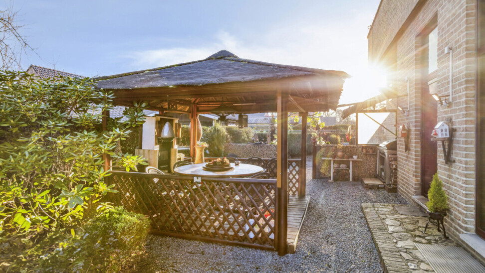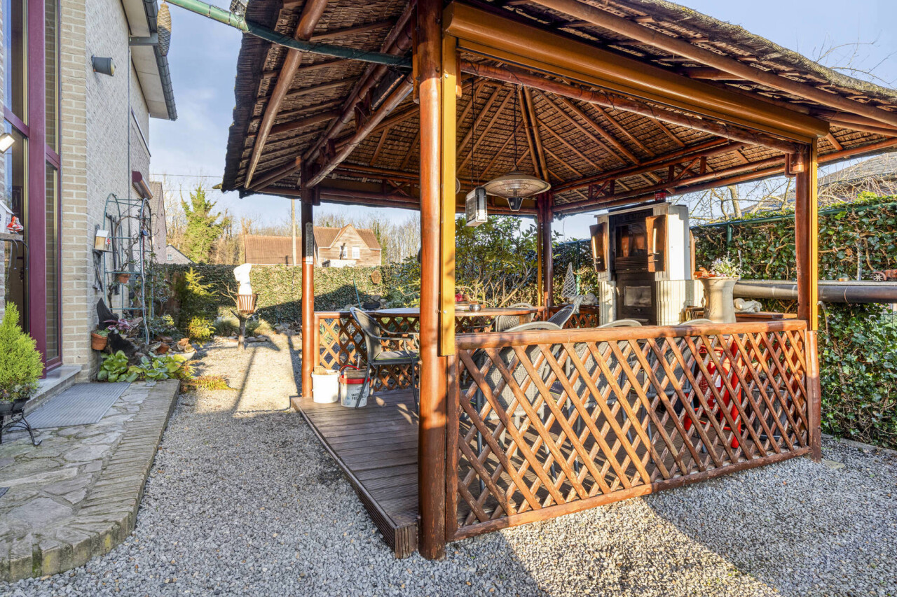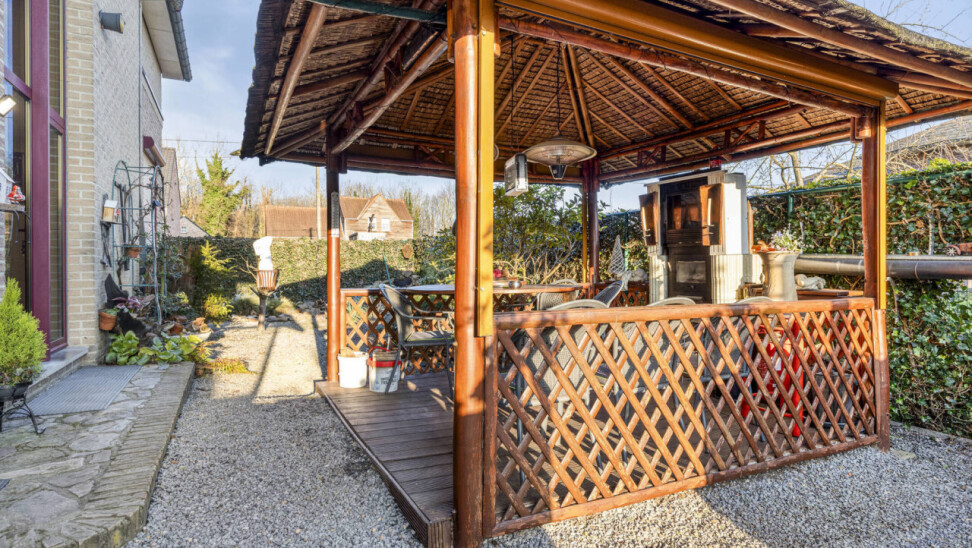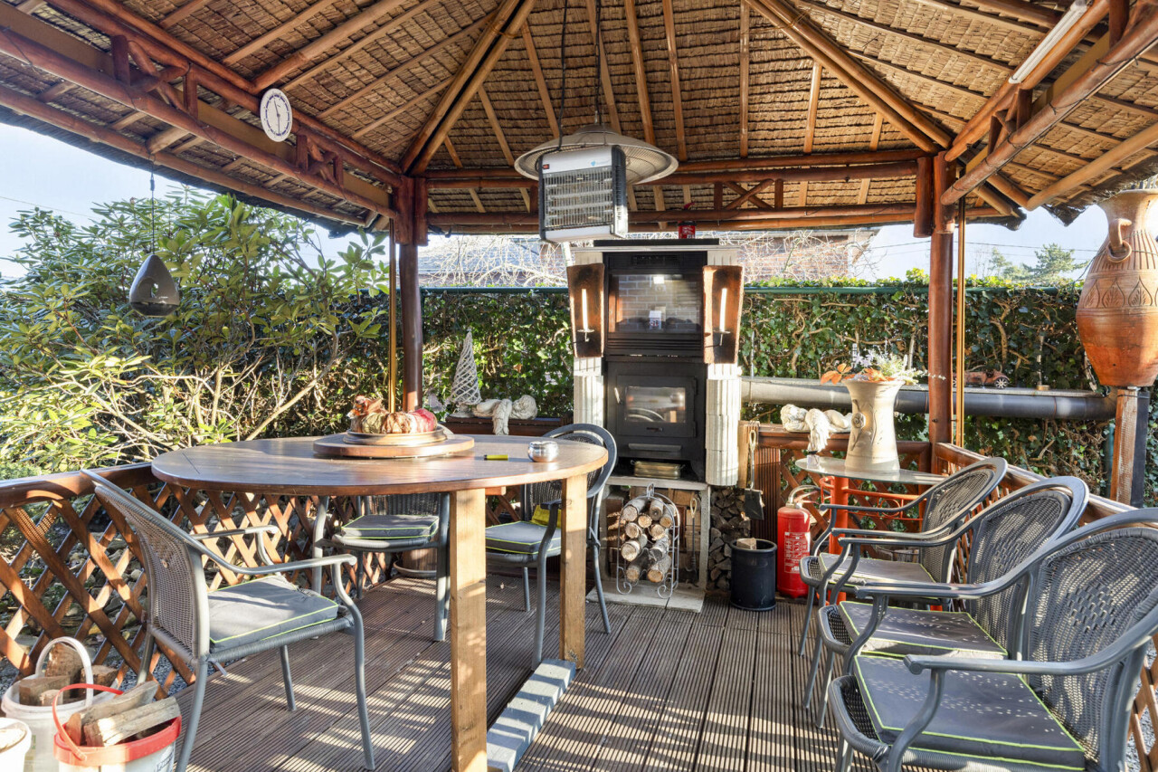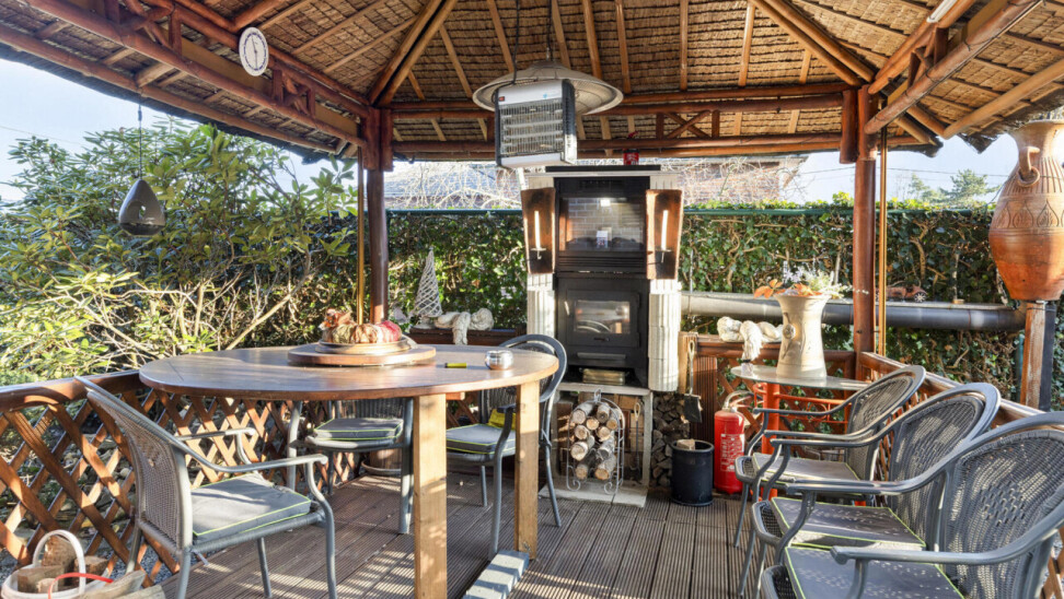 Aan de buitenzijde vinden we er een overdekte tuinpaviljoen, uitgevoerd in hout met een rieten dak. Het wordt gebruikt als gezellige buitenruimte, met zitplaatsen en een buitenhaard of barbecue, ideaal om het hele jaar door buiten te genieten, ook bij minder goed weer.
