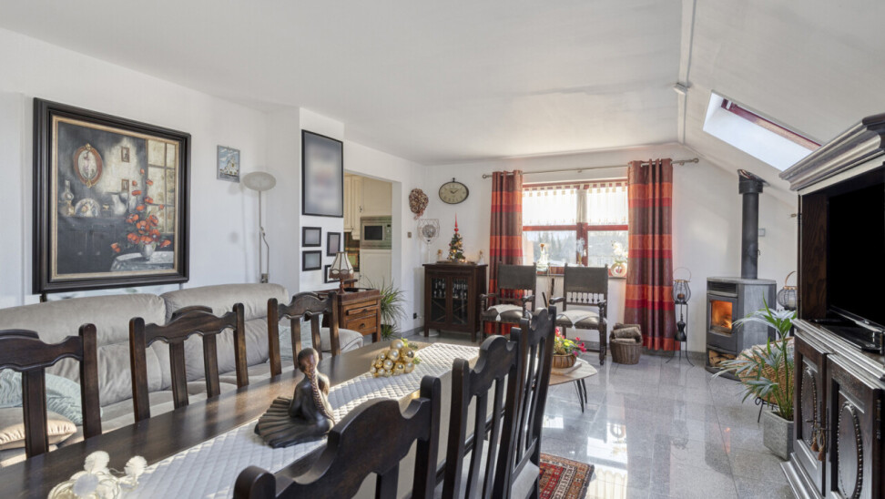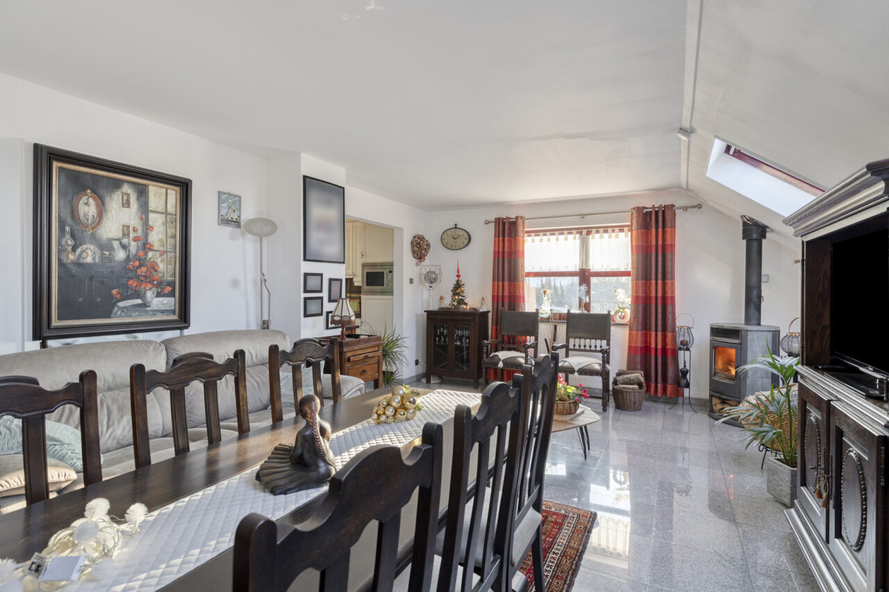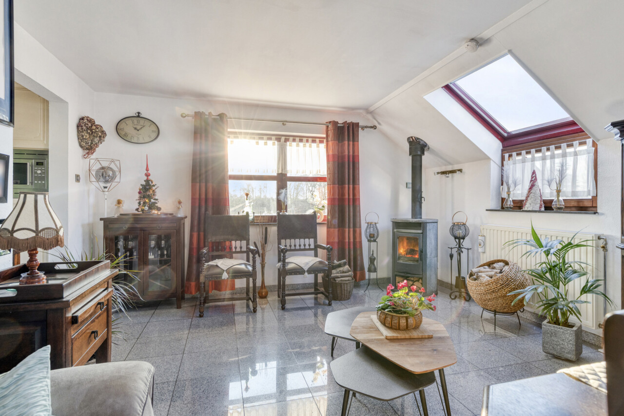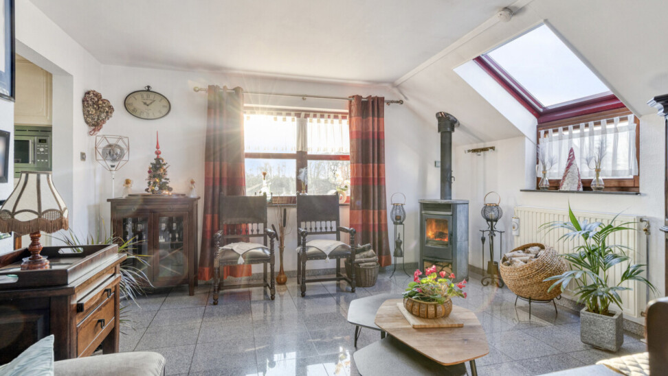 De living en eetkamer zijn voldoende ruim en zijn uitgerust met een goedwerkende houtkachel. Hierdoor kan men het hele appartement verwarmen zodat de verwarming kosten ( aardgas) zeer laag uitvallen.