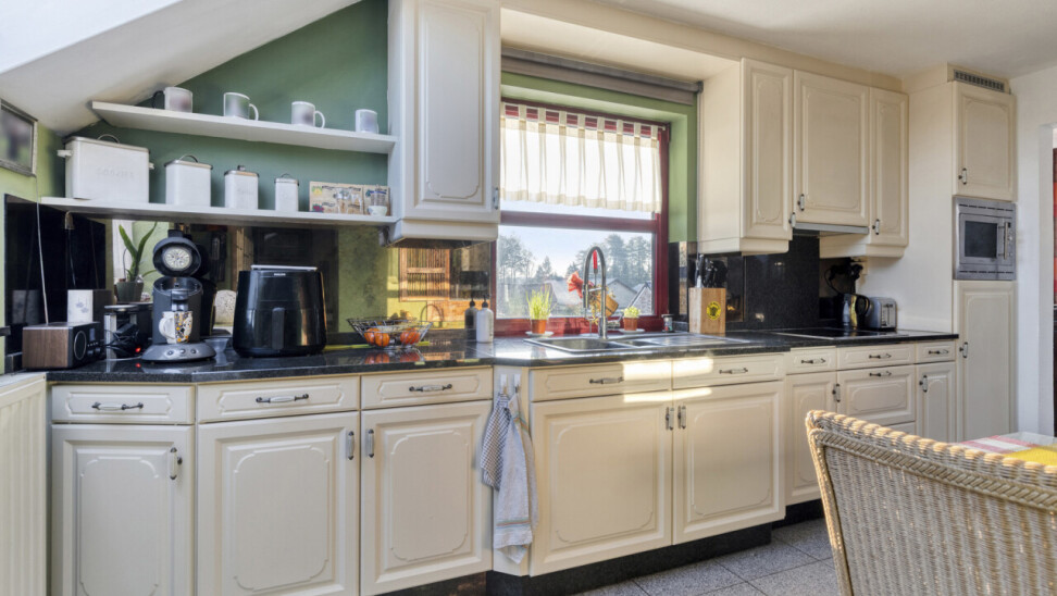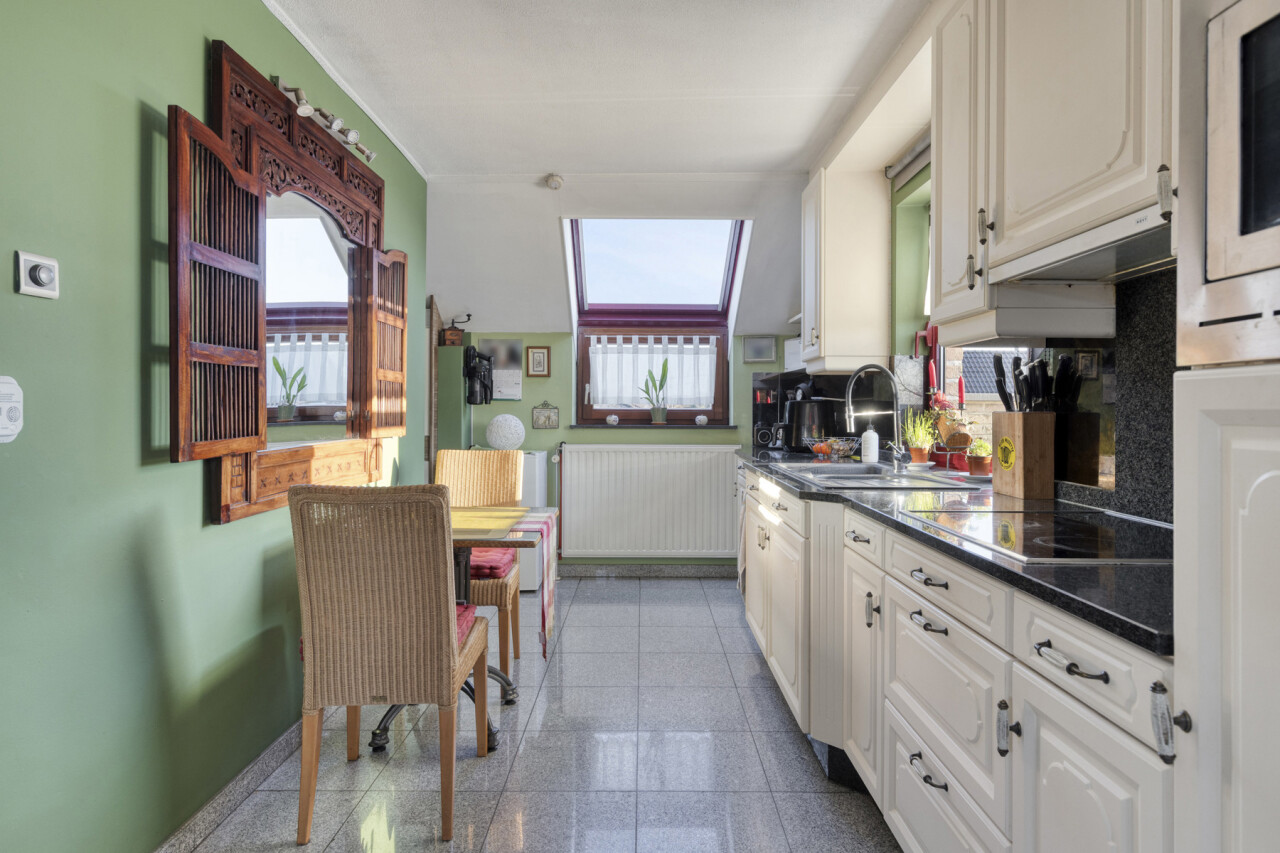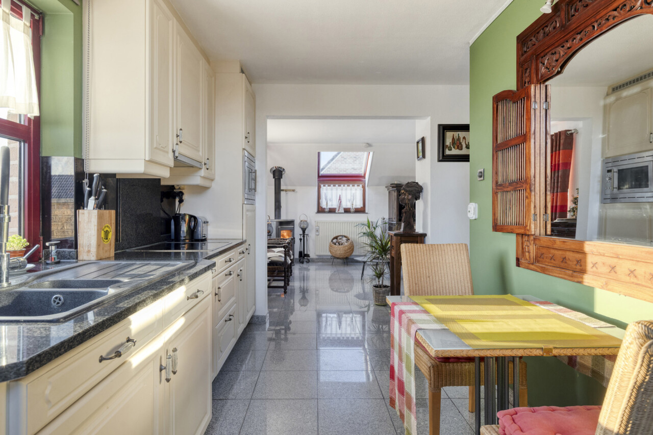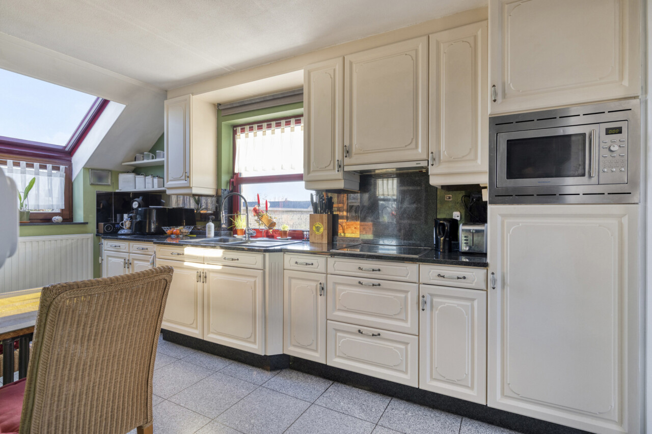 De keuken is voorzien van een combi-oven, een lavabo , een keramische kookplaat en zeer vele opbergkastjes die men ook in de bijkeuken heeft verder getrokken. Ook de wasplaats is zeer praktisch ingericht.
