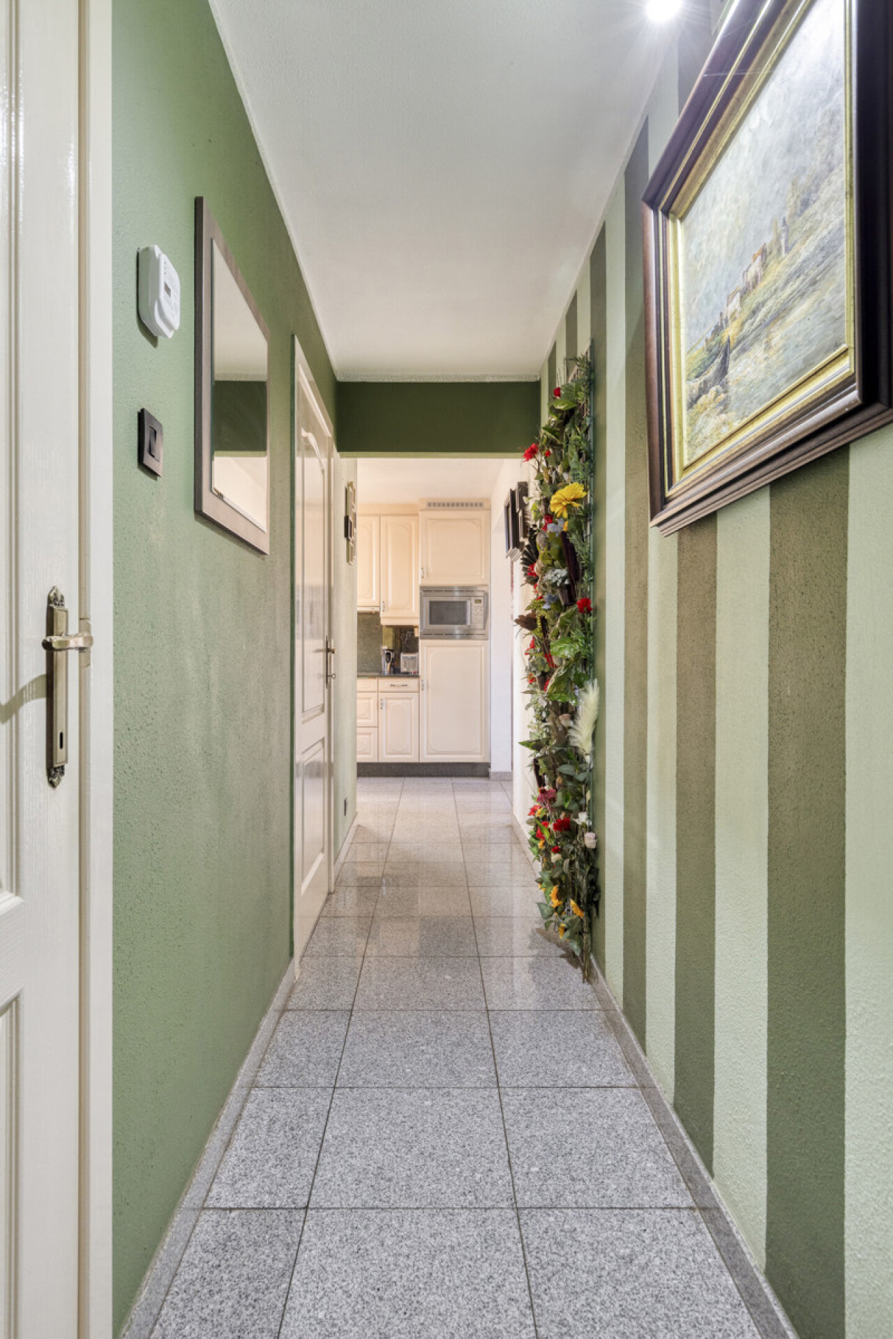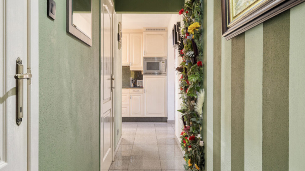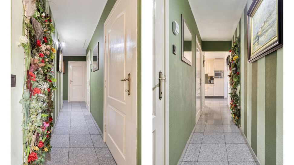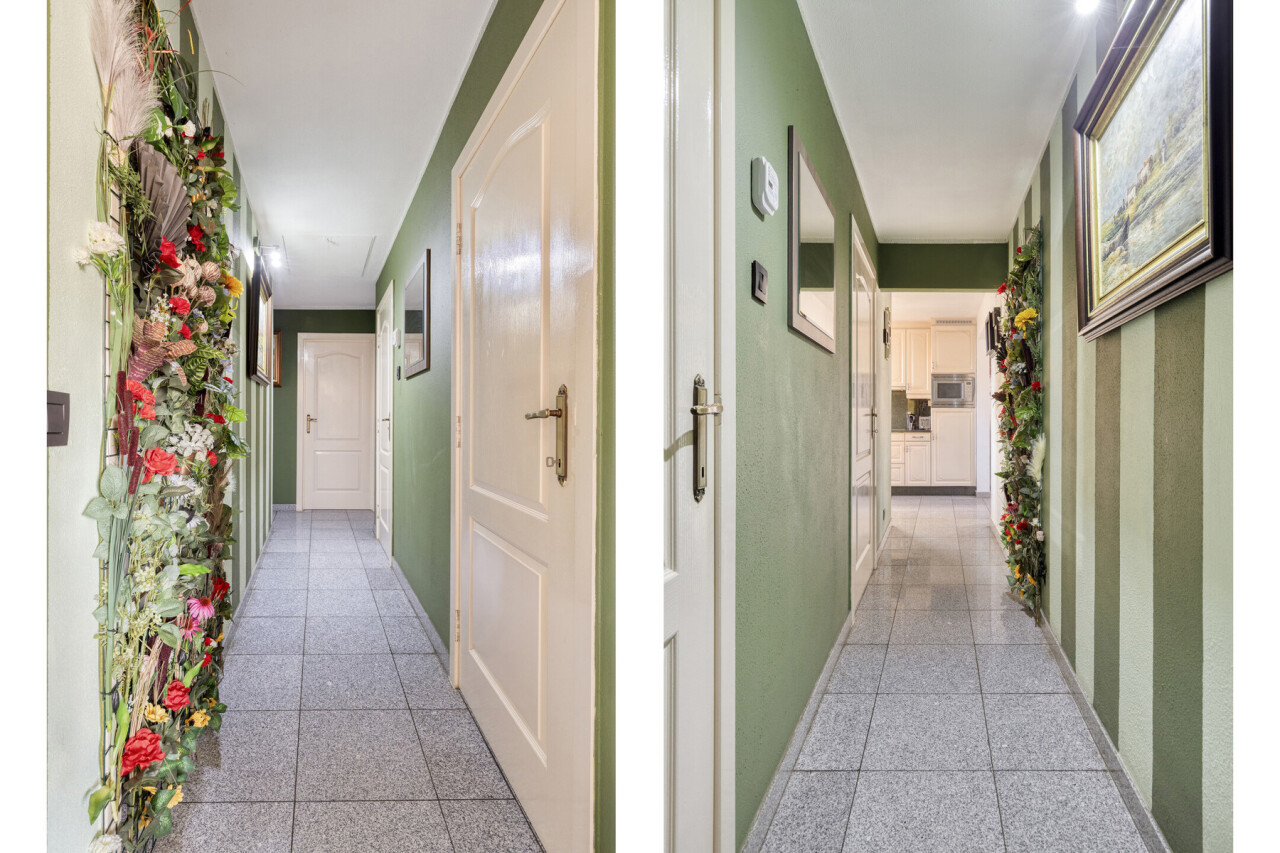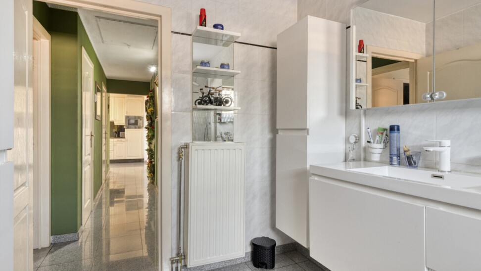 Wanneer we binnen stappen merken we al de zeer knappe tegelvloer. Deze heeft men in heel het appartement doorgetrokken zodat kuisen een gemak wordt.