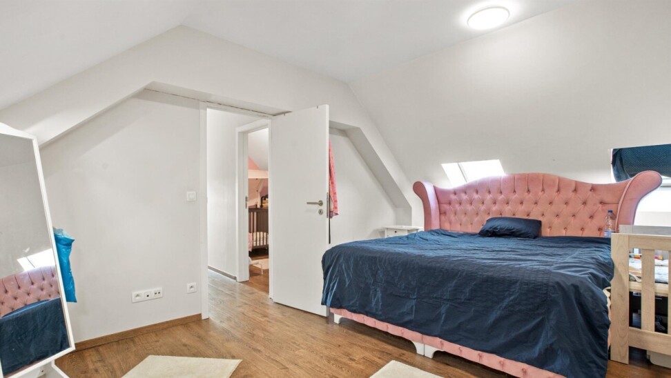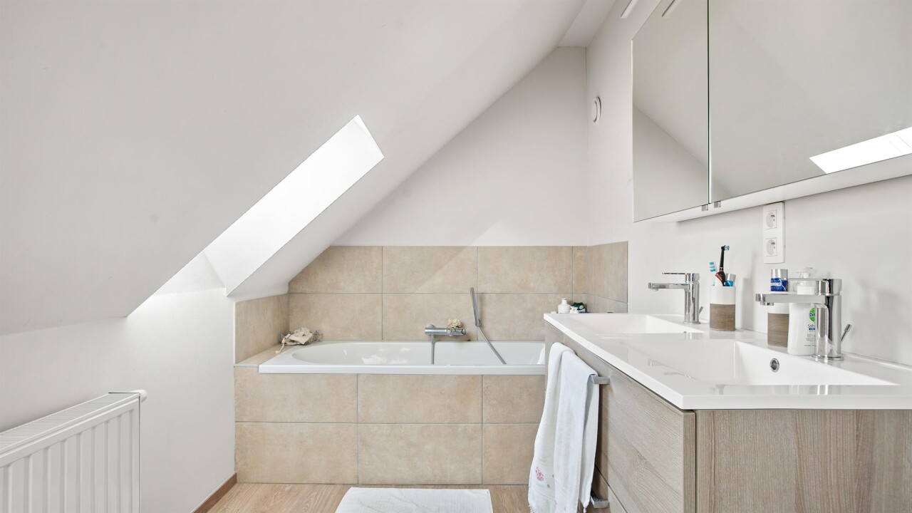 verdieping: 2 slaapkamers, badkamer met dubbel lavabo, bad en toilette.