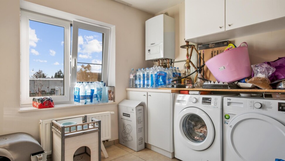 Verder vinden we er een ruime berging met de nodige aansluitingen voor de wasmachine en droogkast.