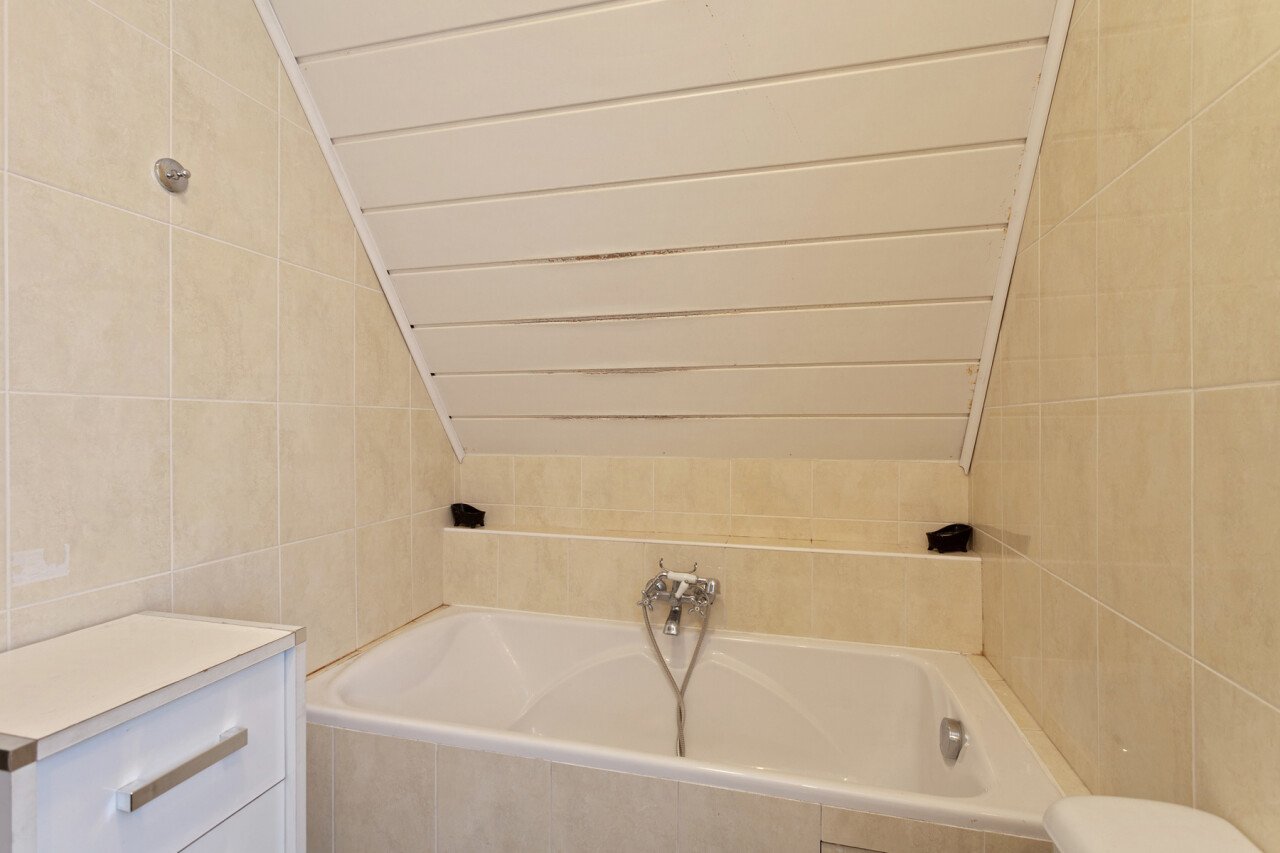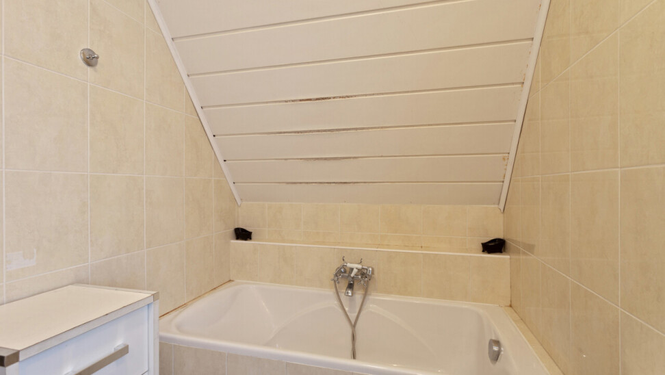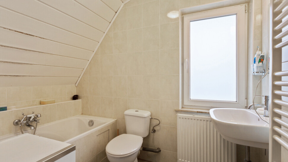 Als we de trap naar boven nemen, vinden we er de 3 slaapkamers en badkamer terug. De slaapkamers zijn voldoende ruim en voorzien van aansluitingen voor televisie. De badkamer is volledig ingericht met een ligbad, lavabomeubel met spoelbak en een toilet.