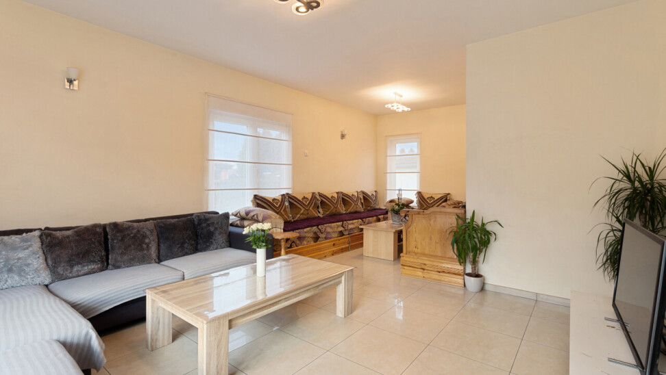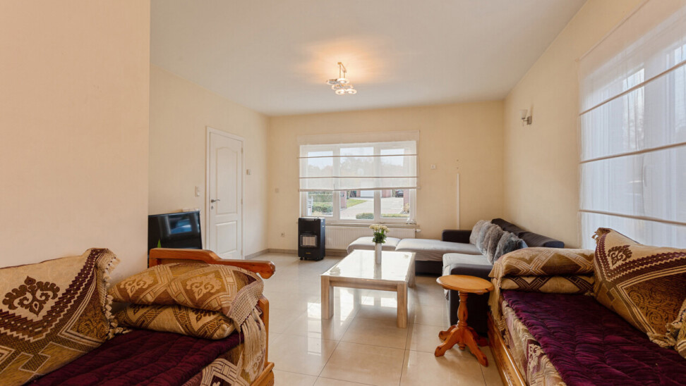 We betreden de woning via de verzorgde inkomhal aan de voorzijde. Hier is een gastentoilet aanwezig. Aan onze linkerzijde vinden we de leefruimte met aansluitend de eetkamer. Door de grote raampartijen hebben we hier voldoende licht wat het ruimtelijk gevoel zeker ten goede komt.